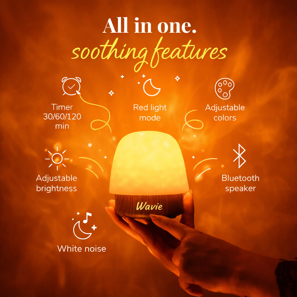 Relax with Wavie—your all-in-one sleep and unwind companion. Create the perfect atmosphere with customizable colors and adjustable brightness, tthen drift off to sleep with soothing white noise. With its built‑in Bluetooth speaker, red light mode, and auto-off timers (30/60/120 mins), Wavie is not just a lamp—it is your nightly wind‑down ritual.